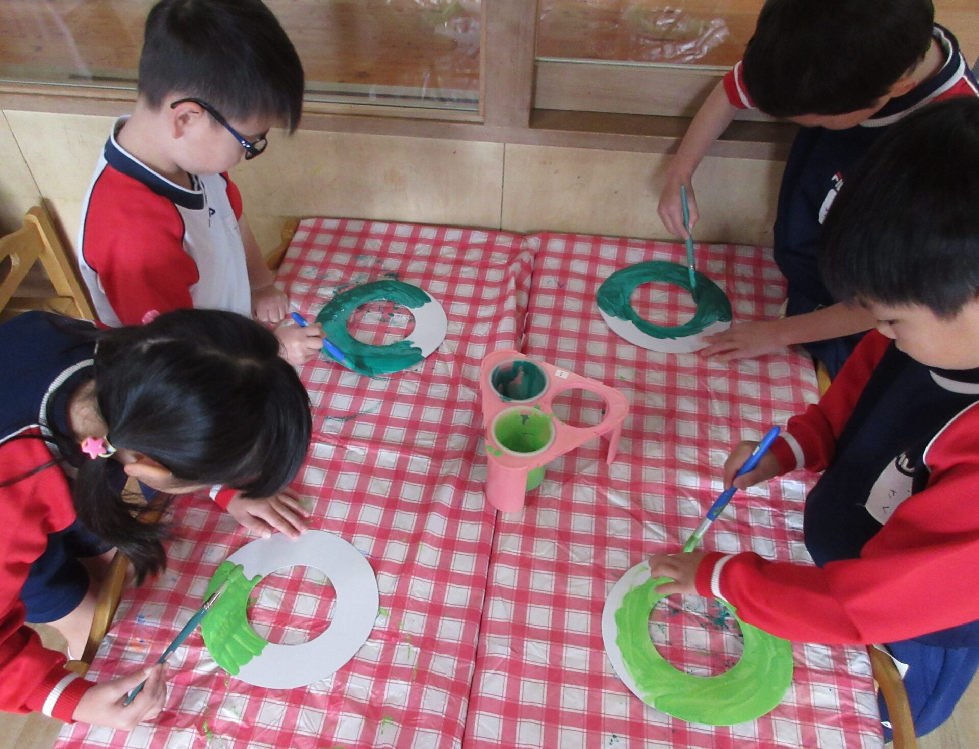 2025.12.15 園の様子クリスマスに向けてクリスマスツリーの飾りを描いて飾ったり、リースの土台に色を塗りました。