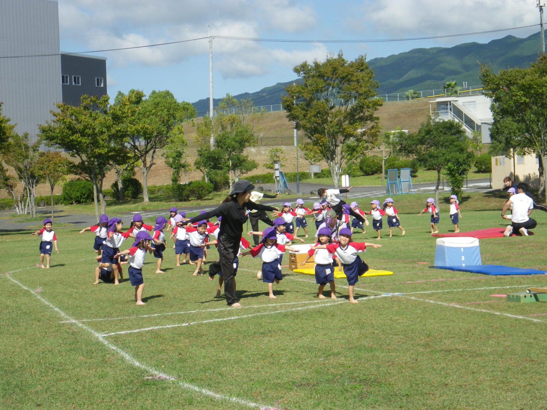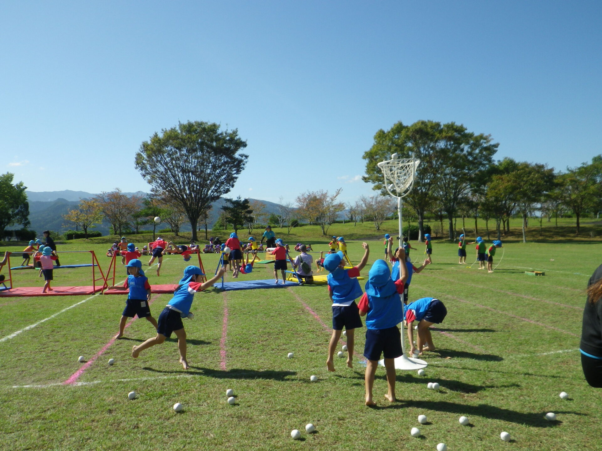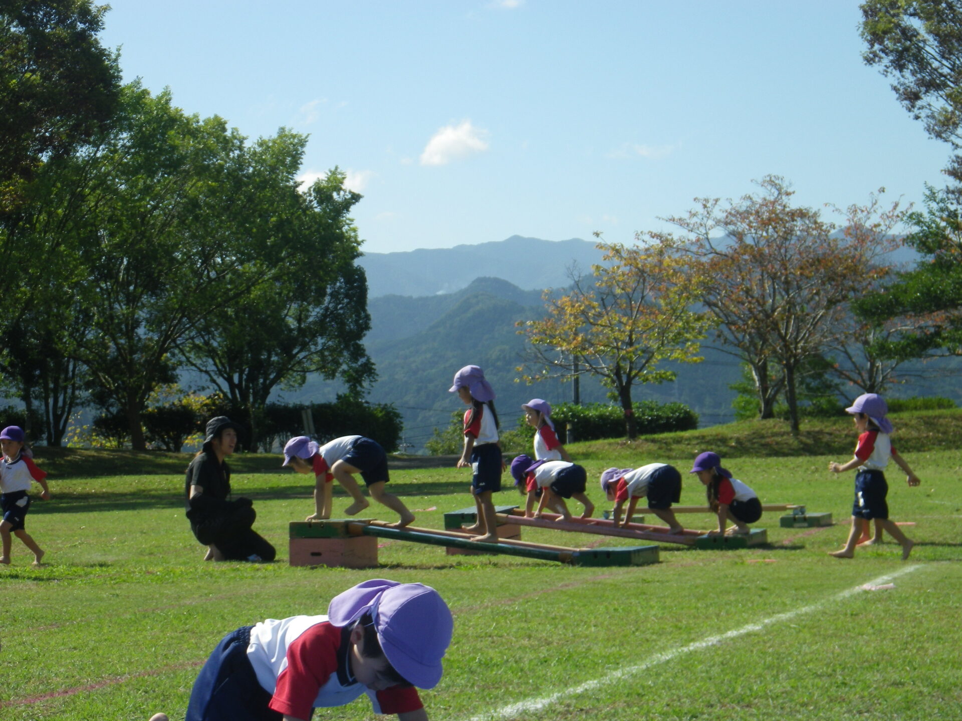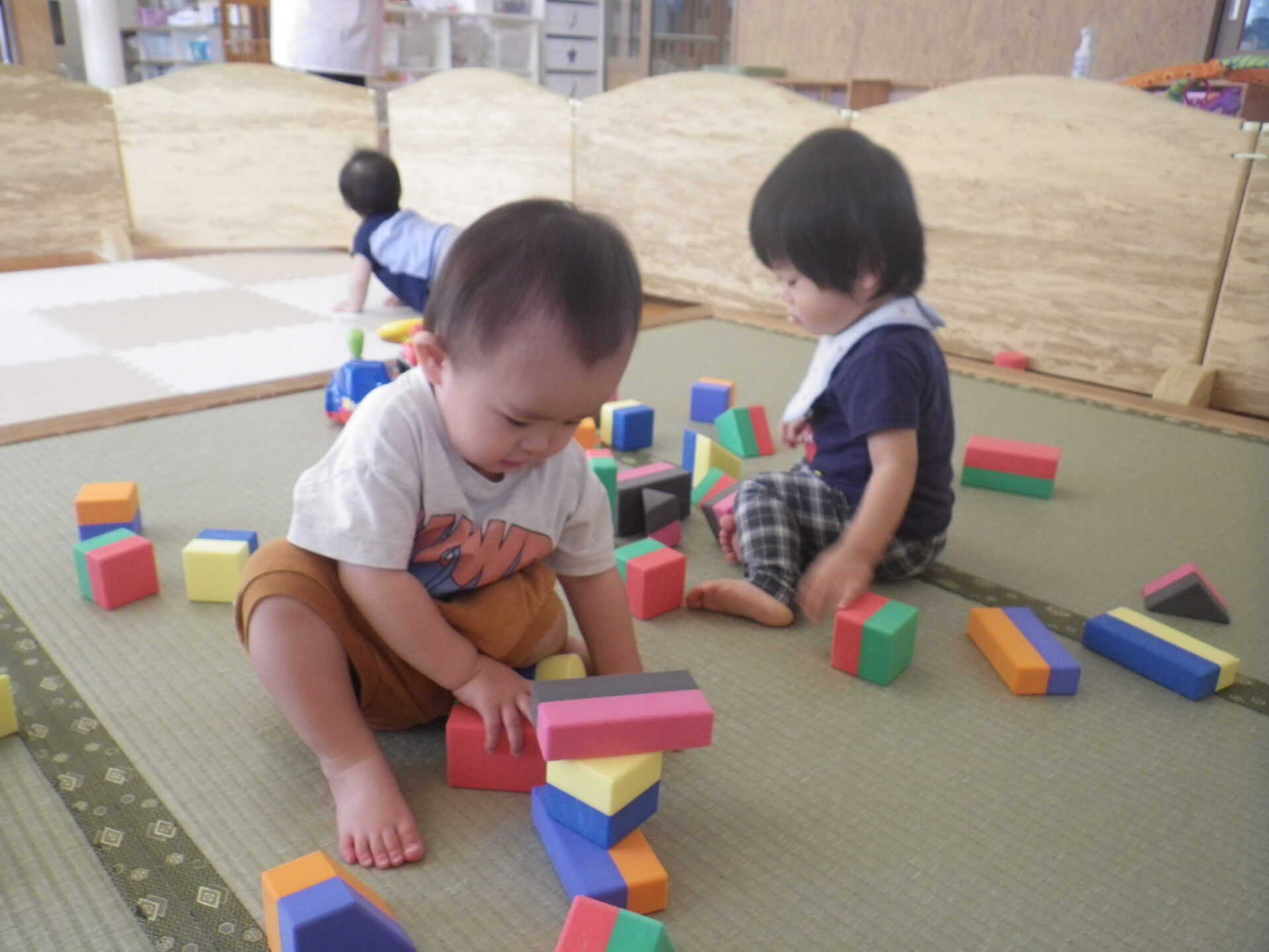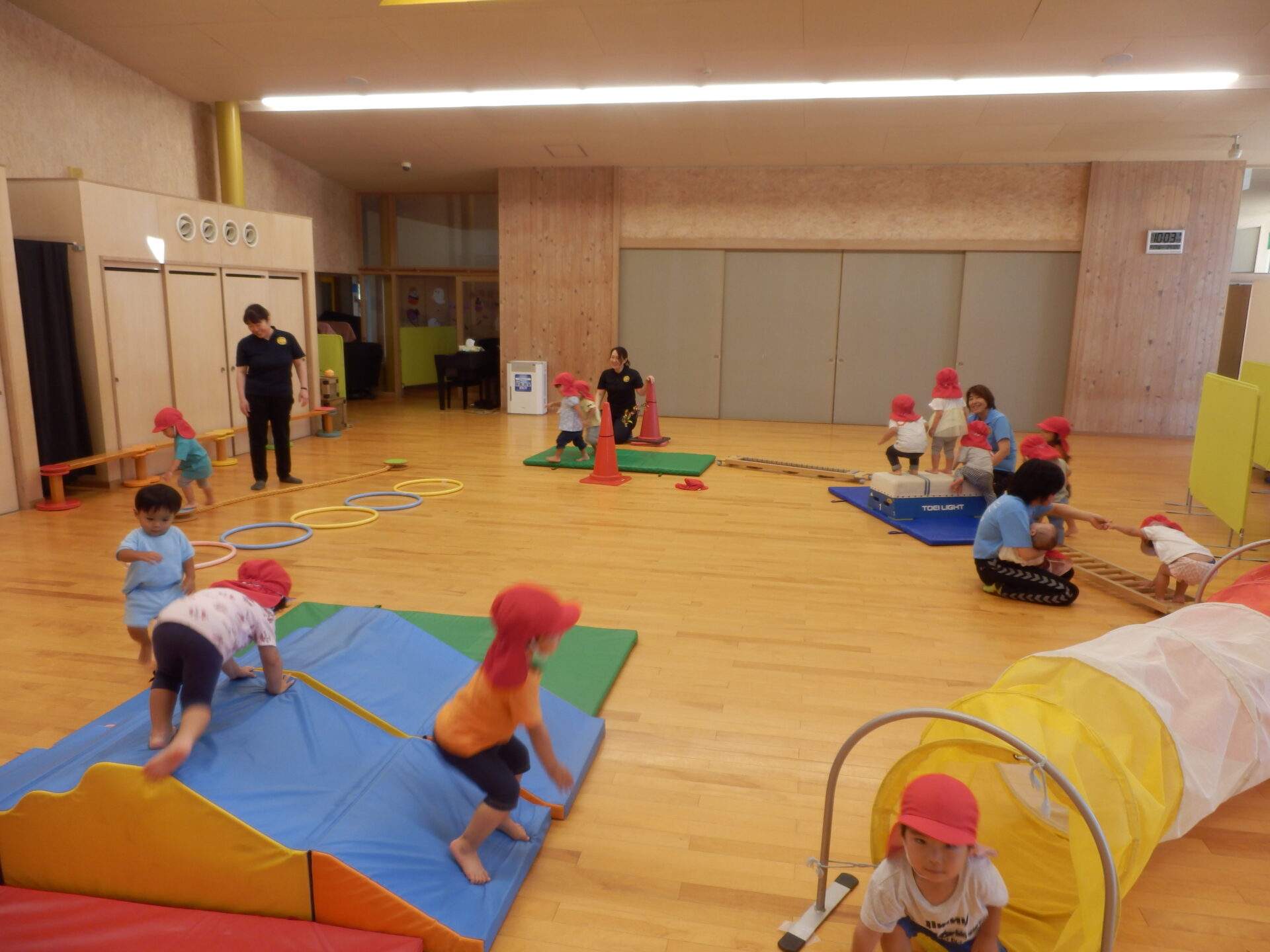 0歳と1歳はホールでサーキットをしたり、室内でカラフルなソフトブロックで遊んで楽しく過ごしました!