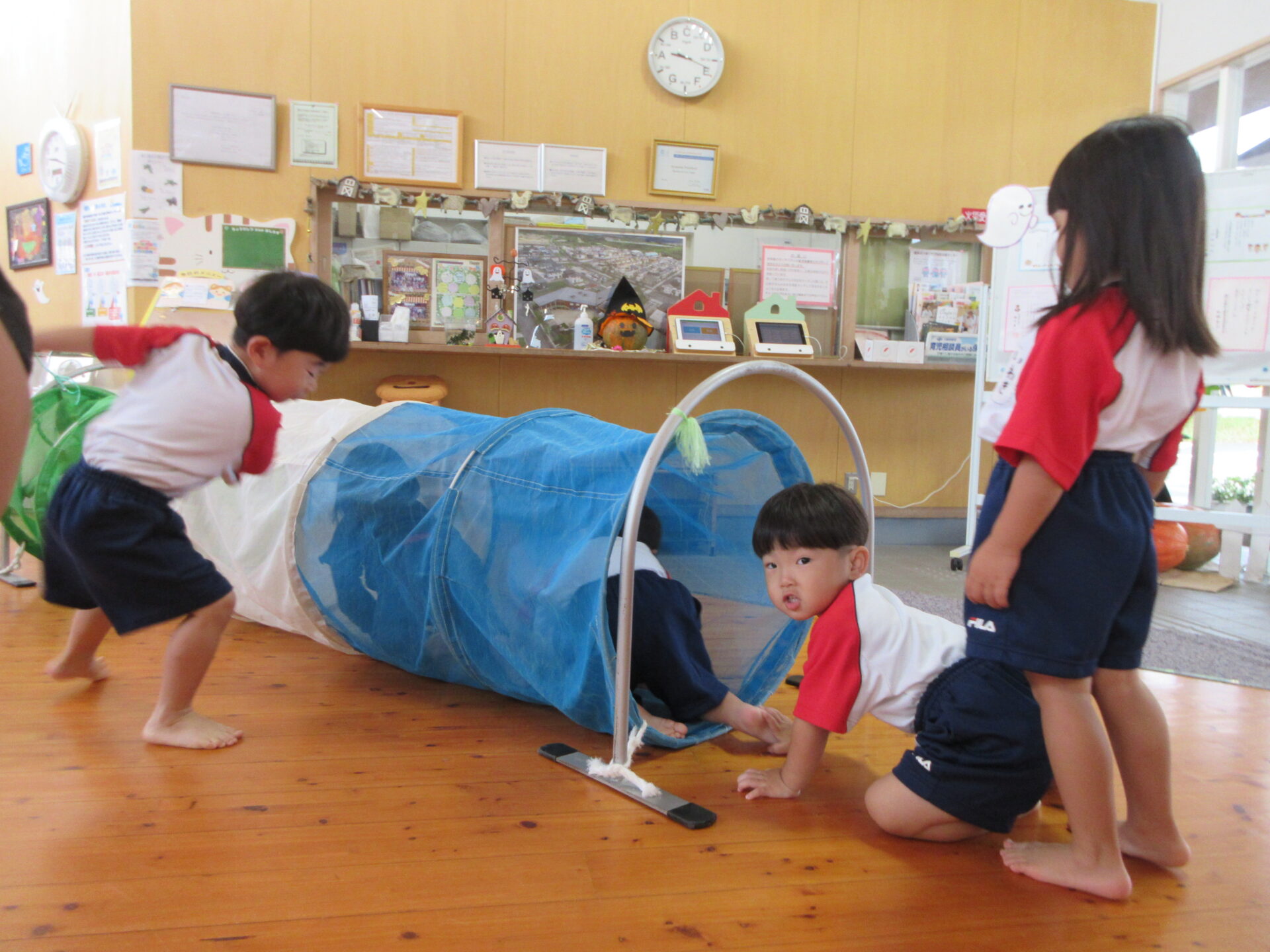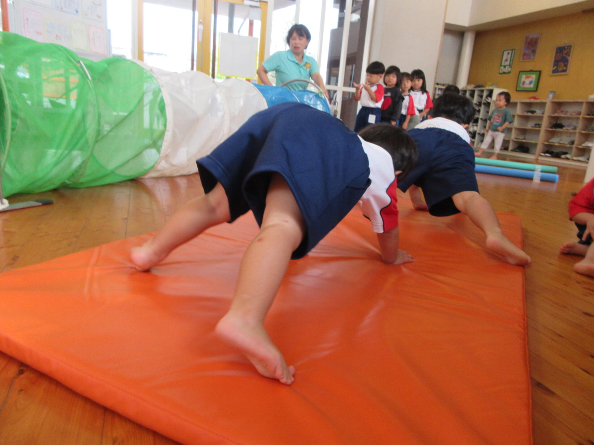 今日はトンネルやマット、プールスティックで元気いっぱい体を動かしました。