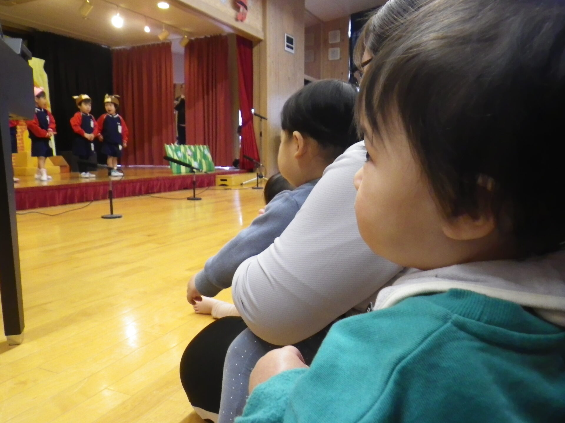 舞台に立っているお友達に興味津々の様子で、じーっと座って見ていました。
