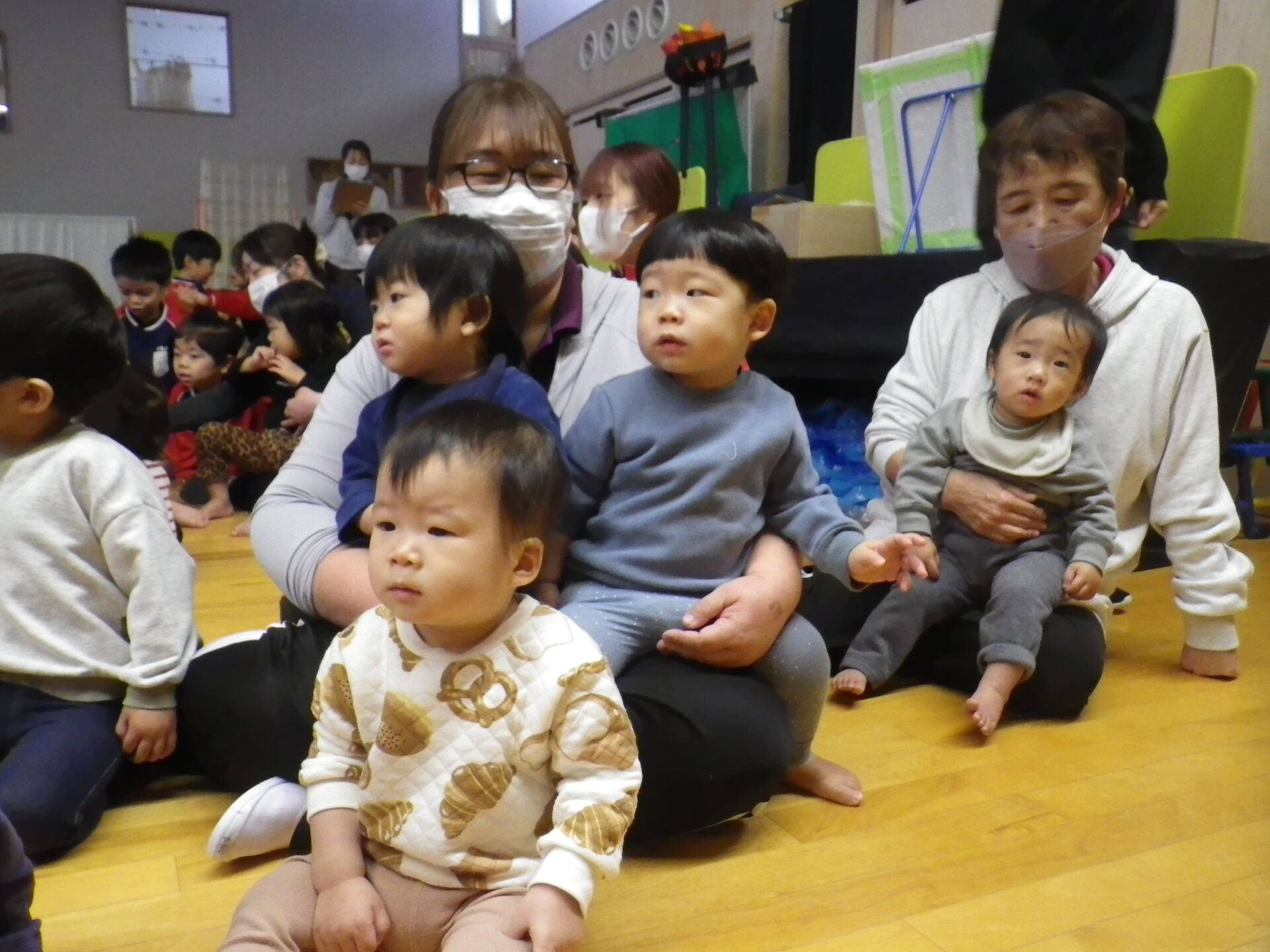 場面が変わる度に、“次はなに?”と覗き込んだり、楽しい音楽が流れると手拍子したり体を揺らしたりと、びーんず組の子ども達も一緒に楽しんでいました。