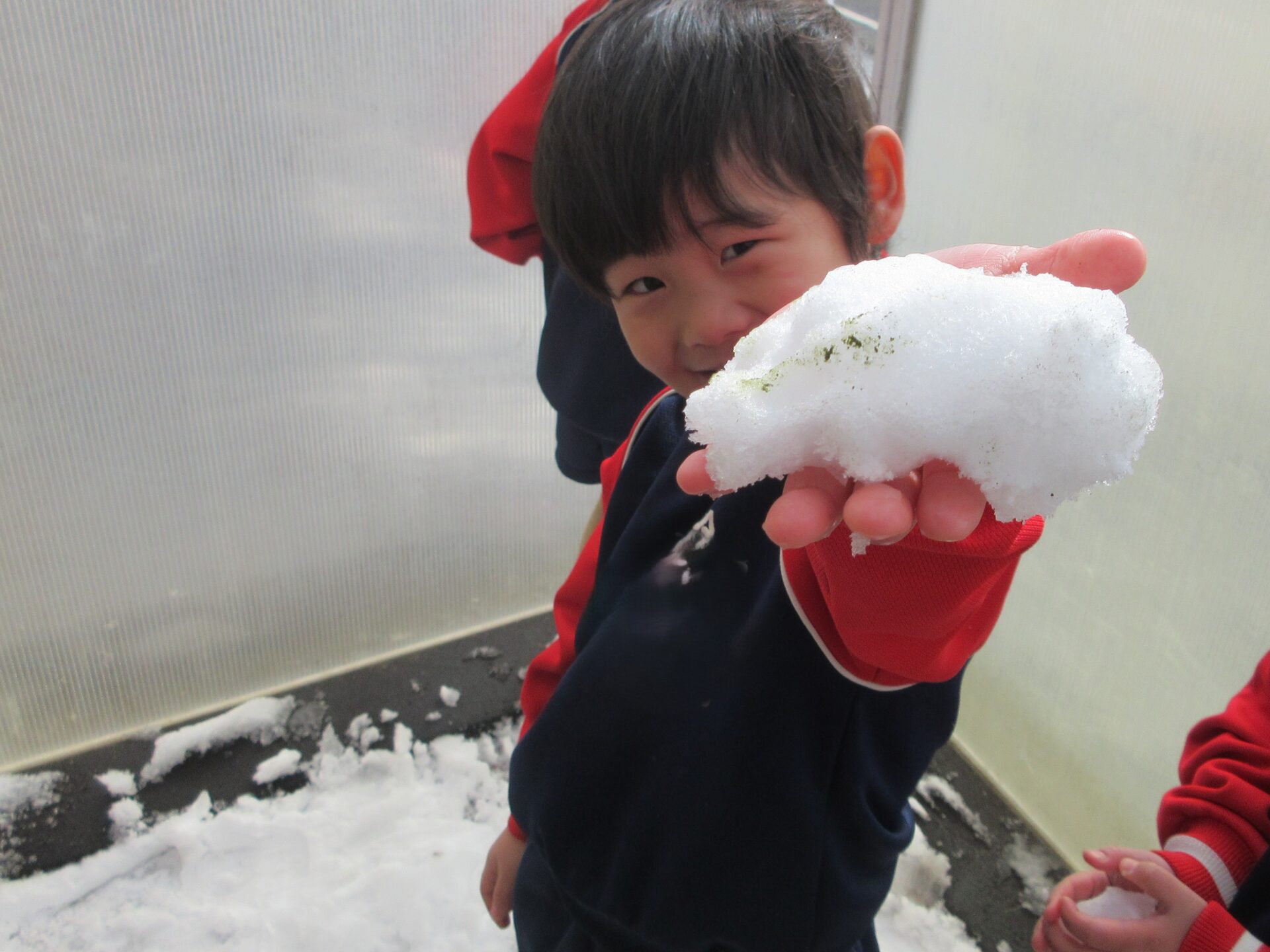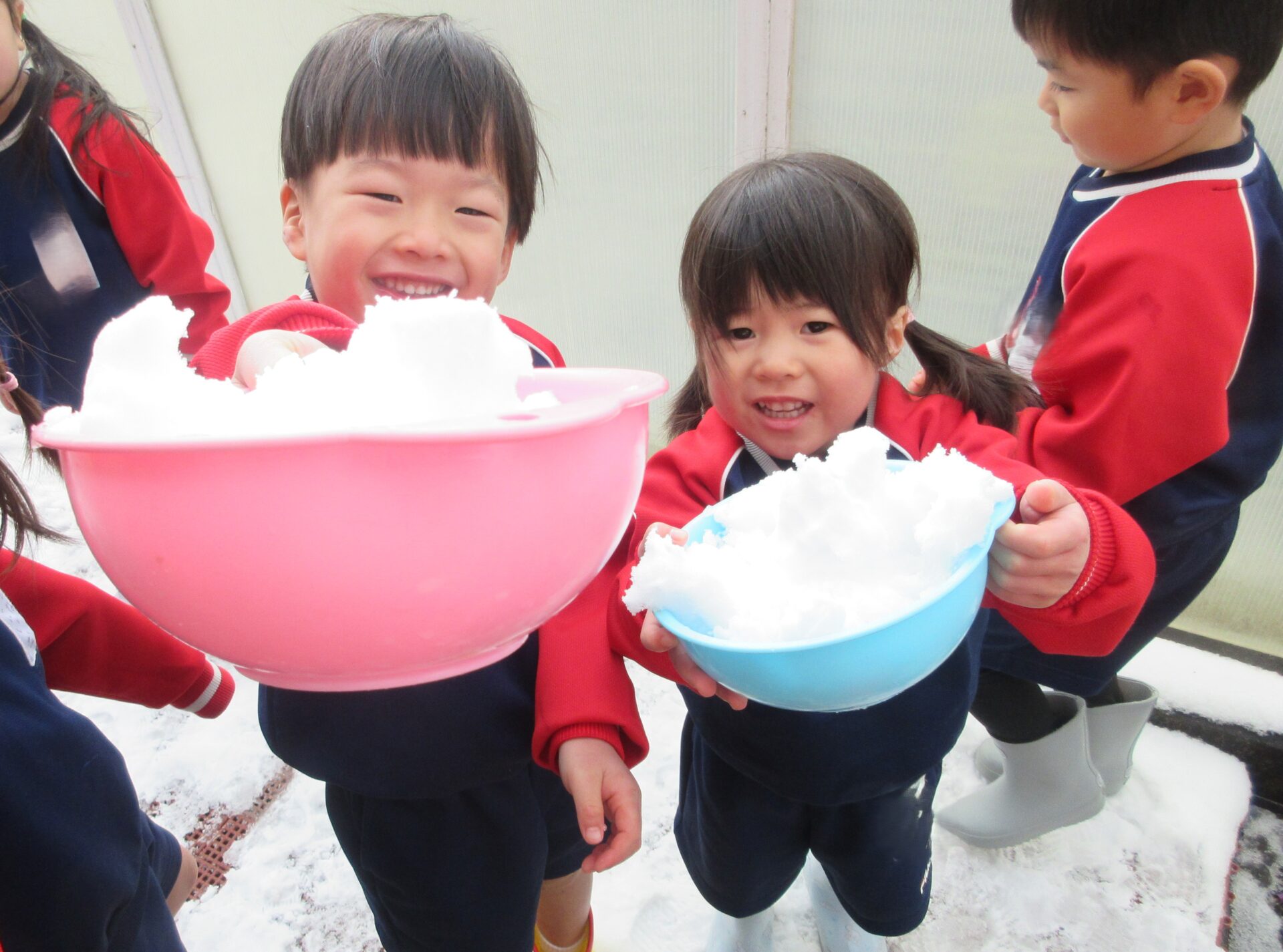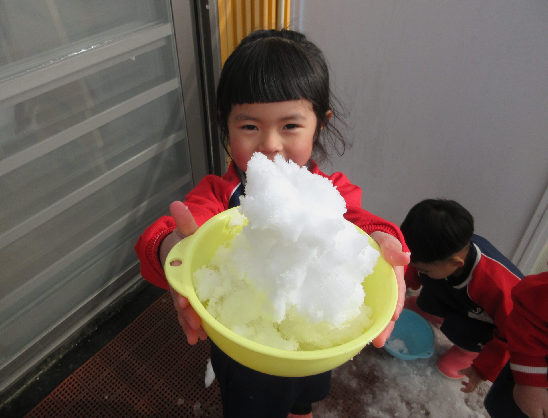 2026.02.09 園の様子今日の朝、みんなでお部屋の外を見ると、雪がたくさん積もりデッキが真っ白になっていました。それを見た子ども達は「雪を触りたい!」と目をキラキラ輝かせていたので、早速デッキに出て雪遊びがスタート☆ ボウルに雪を山盛り入れて「イチゴ味だよ~」とかき氷屋さんになったり、雪を丸めて「梅干し入れたよ♪」とおにぎりを作ってみたり…「冷たいっ」と言いながらも雪の感触を楽しんでいました。