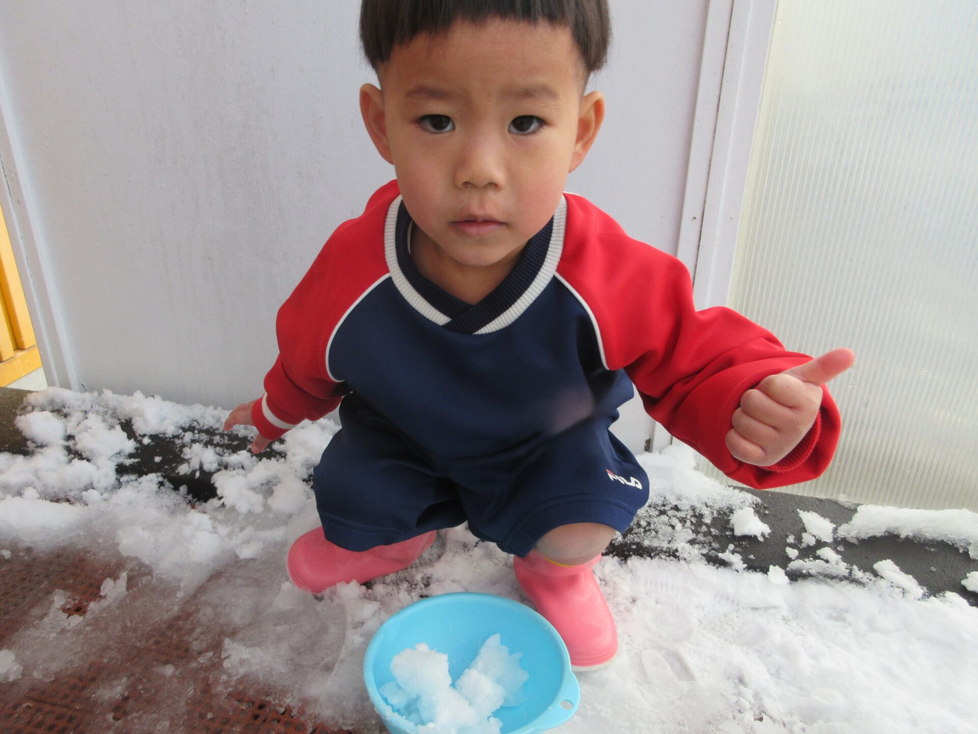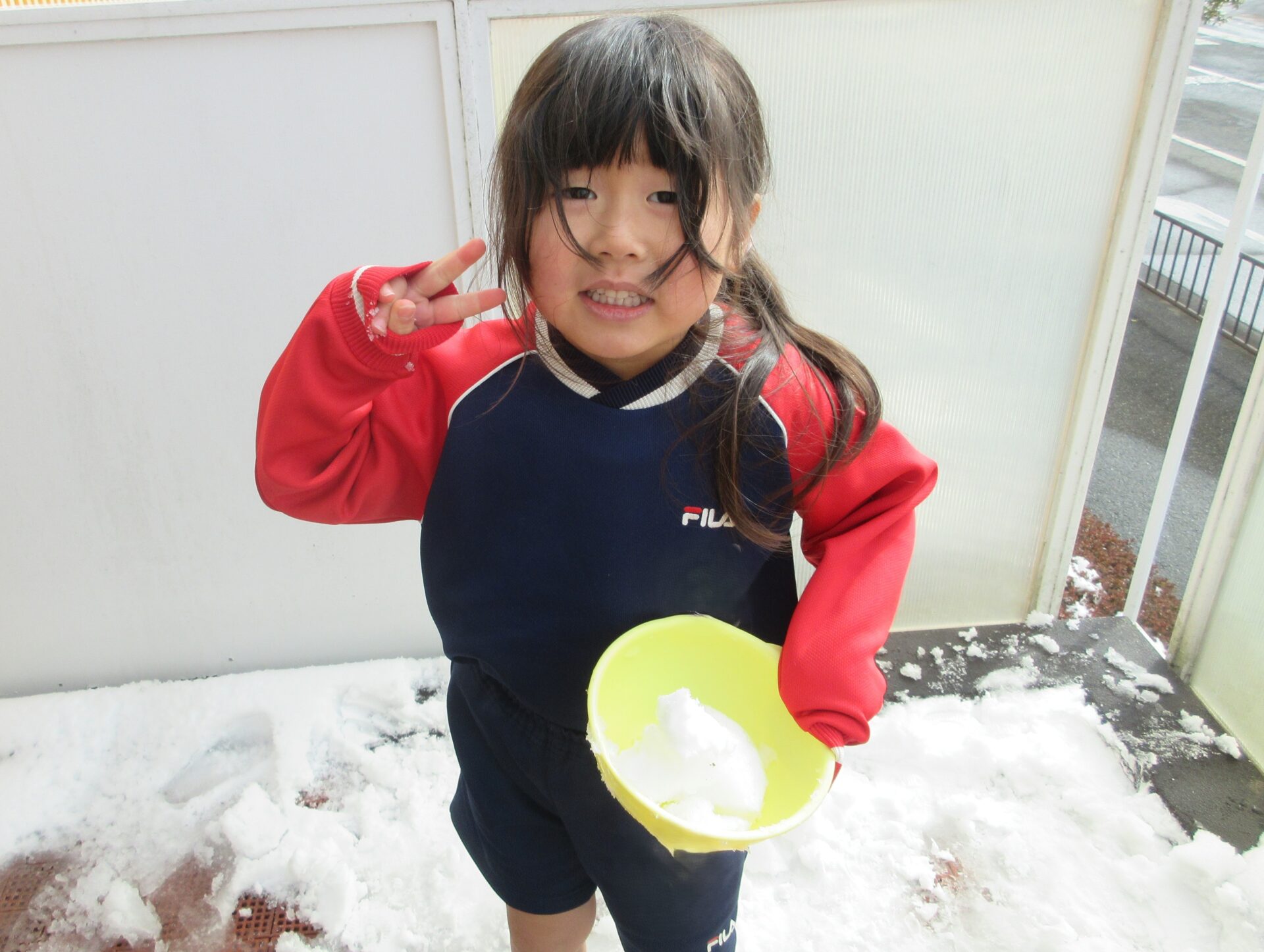 今日の朝、みんなでお部屋の外を見ると、雪がたくさん積もりデッキが真っ白になっていました。それを見た子ども達は「雪を触りたい!」と目をキラキラ輝かせていたので、早速デッキに出て雪遊びがスタート☆ ボウルに雪を山盛り入れて「イチゴ味だよ~」とかき氷屋さんになったり、雪を丸めて「梅干し入れたよ♪」とおにぎりを作ってみたり…「冷たいっ」と言いながらも雪の感触を楽しんでいました。