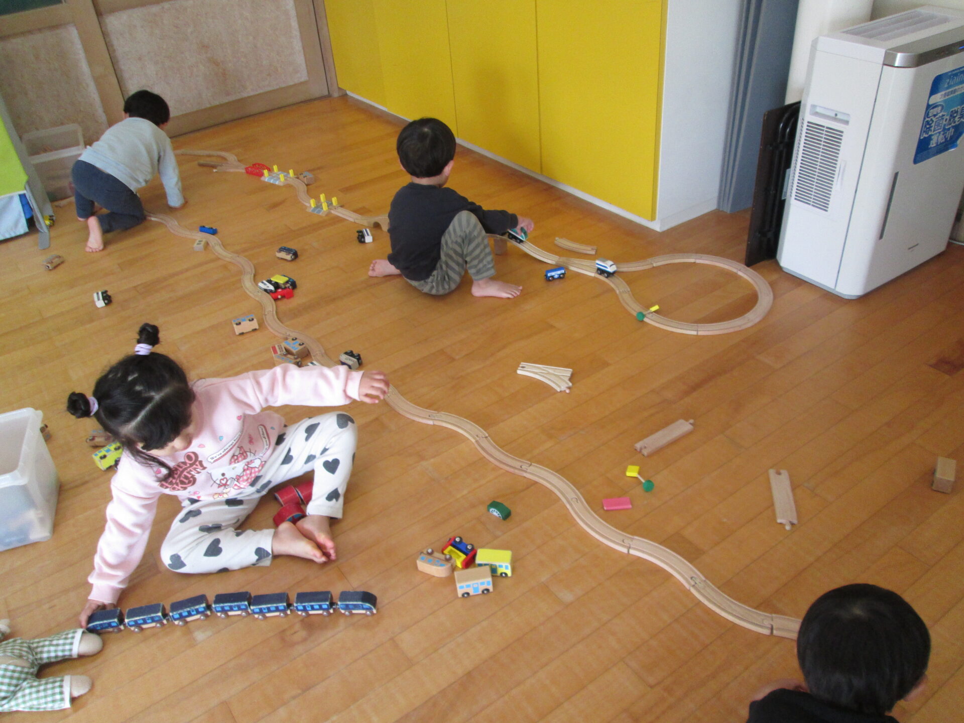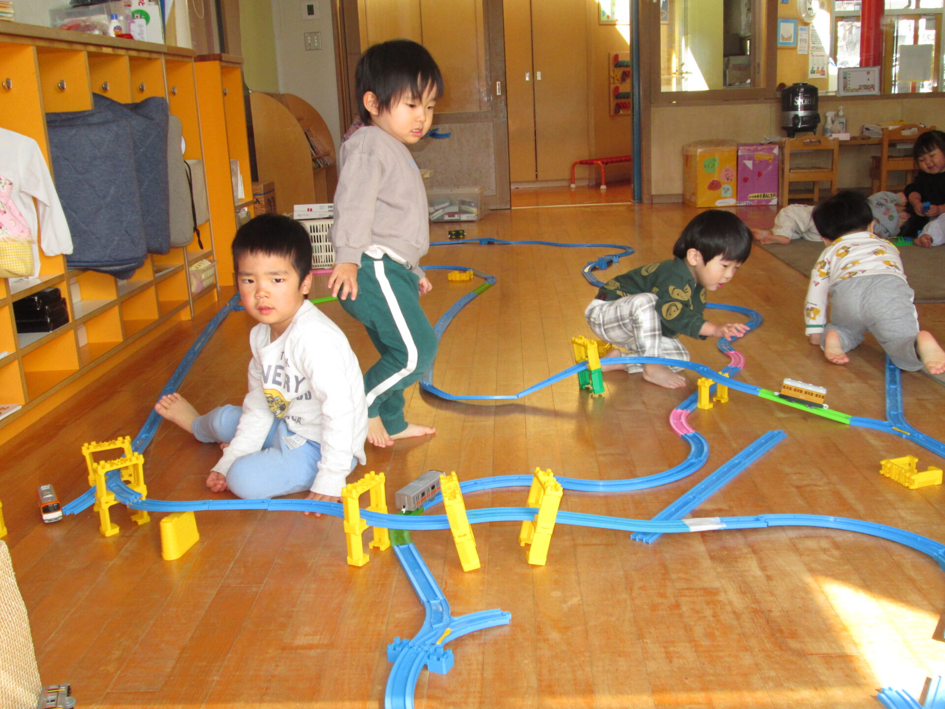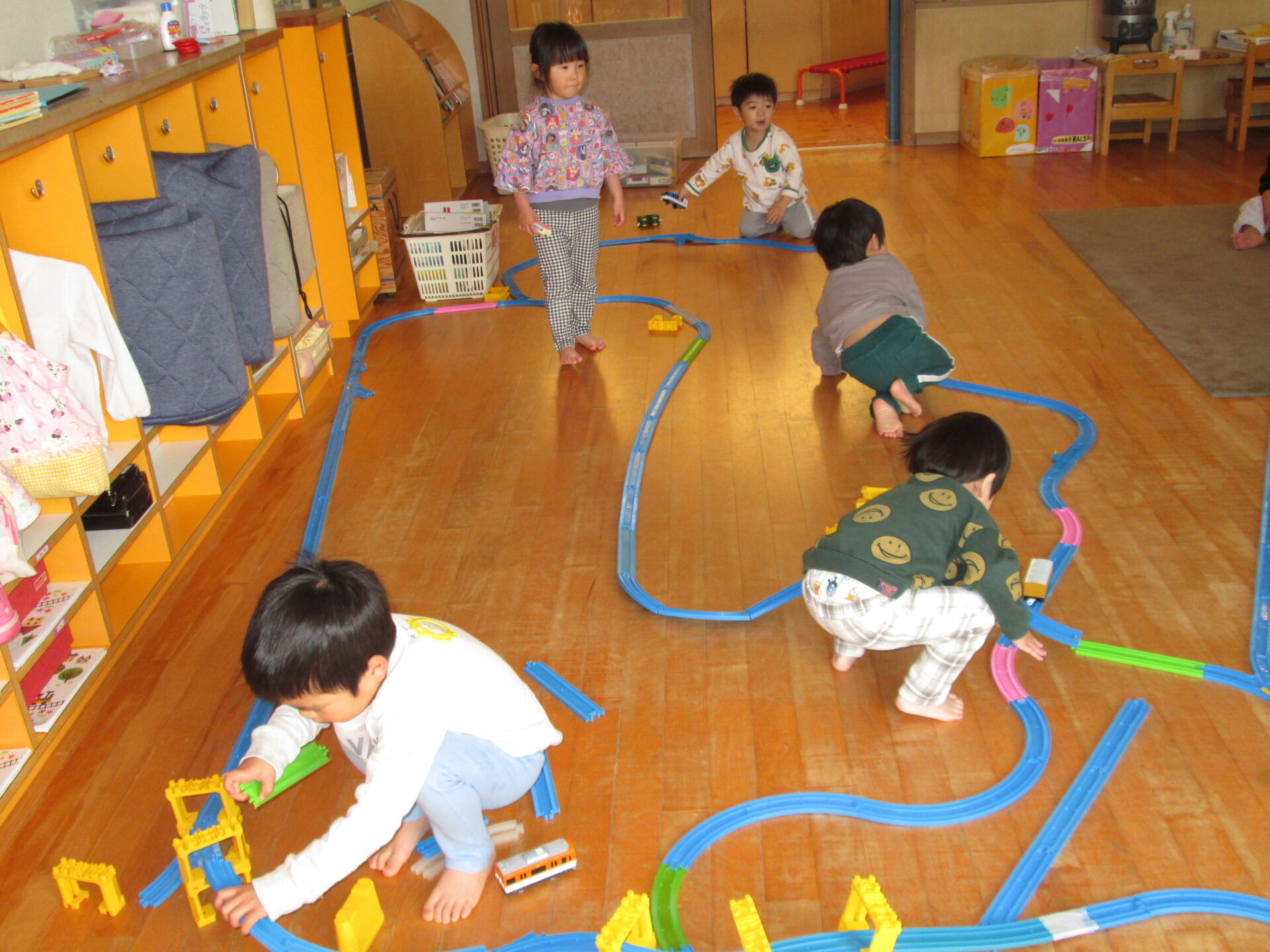 最近はプラレールや線路をお友達と協力して作ることが出来るようになったまっしゅるーむ組さん。
