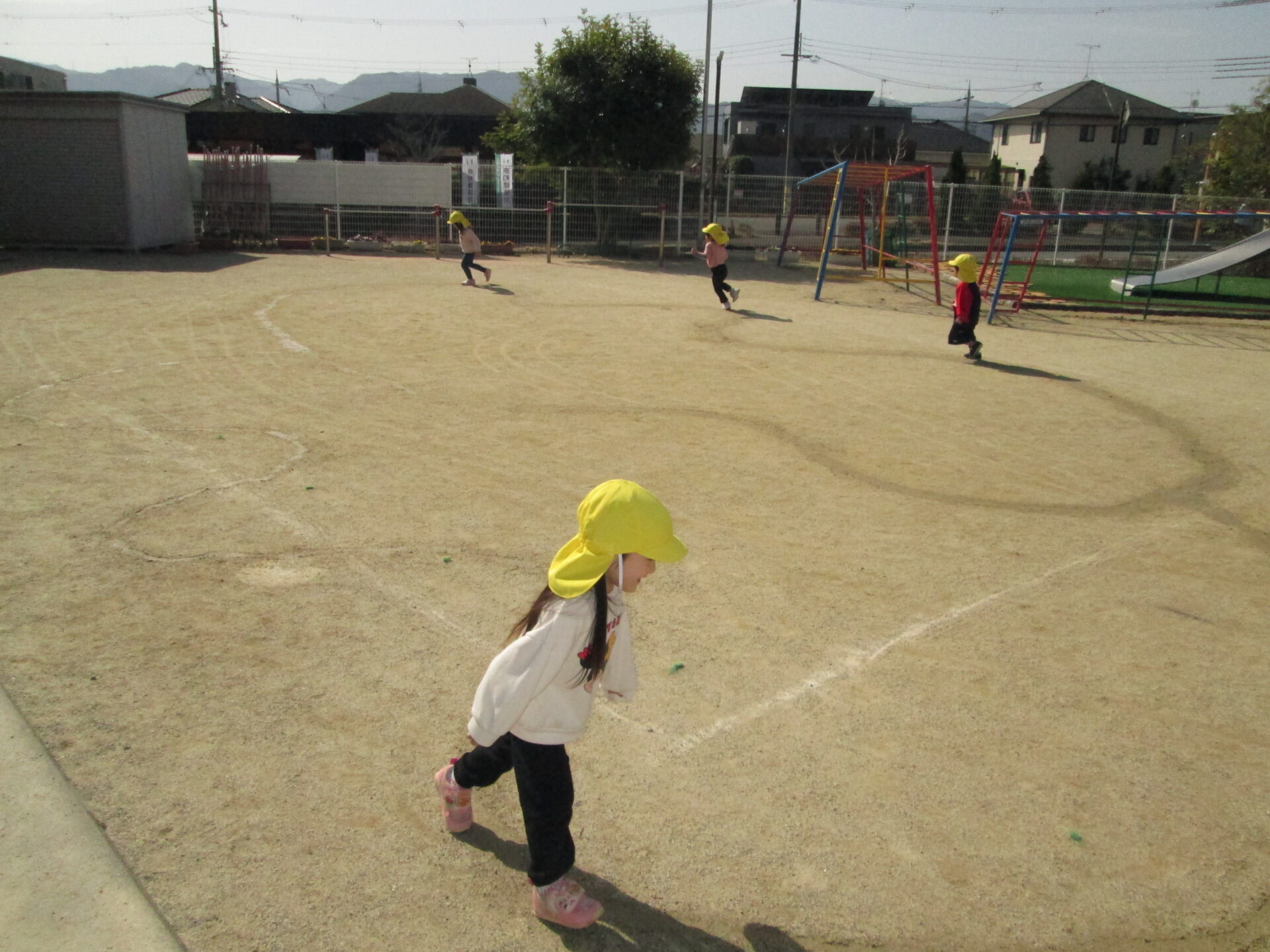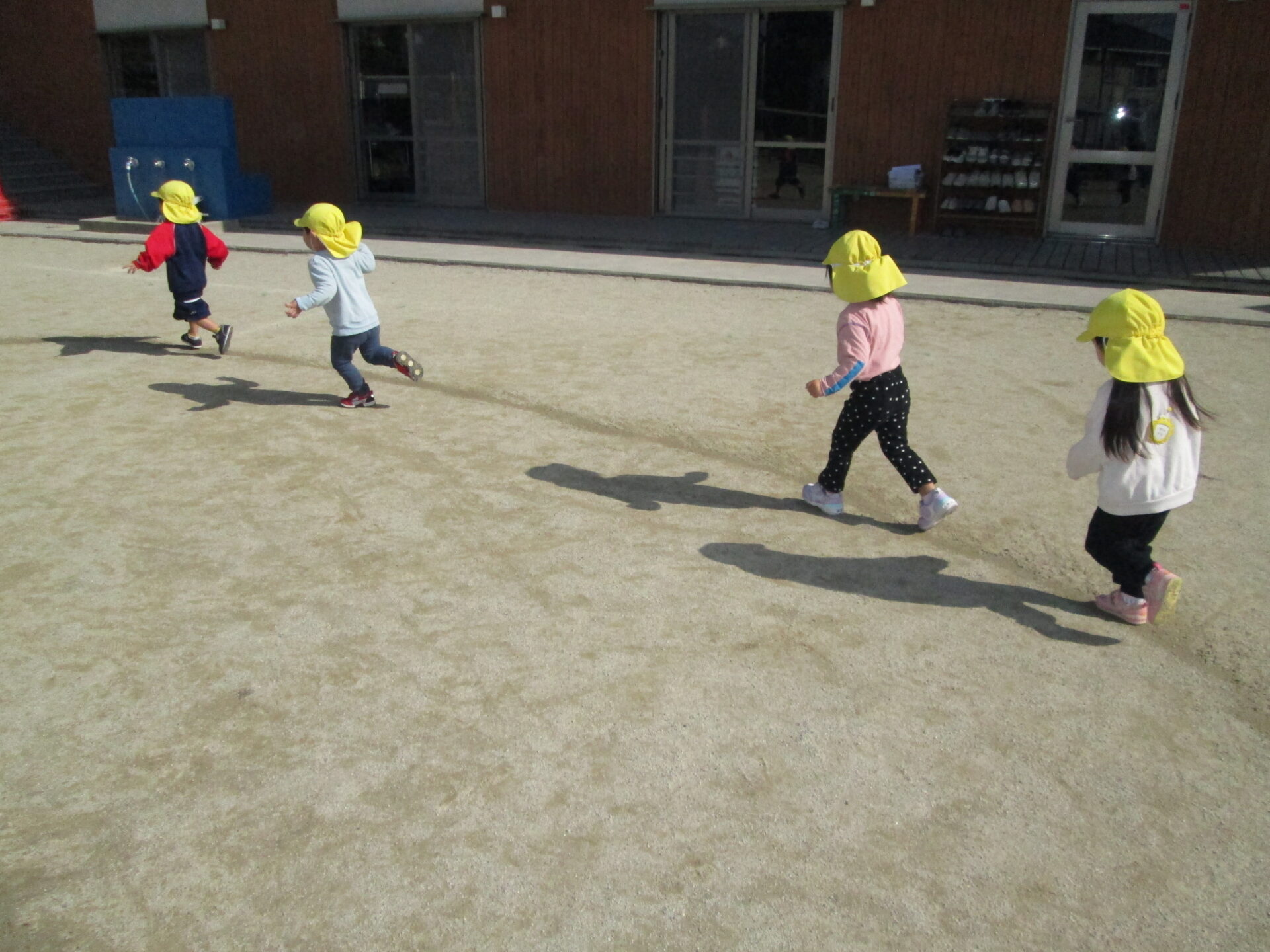 「線の上を走ってみよう、いくよ~!」と保育者が走り出すとキャーと走り出し