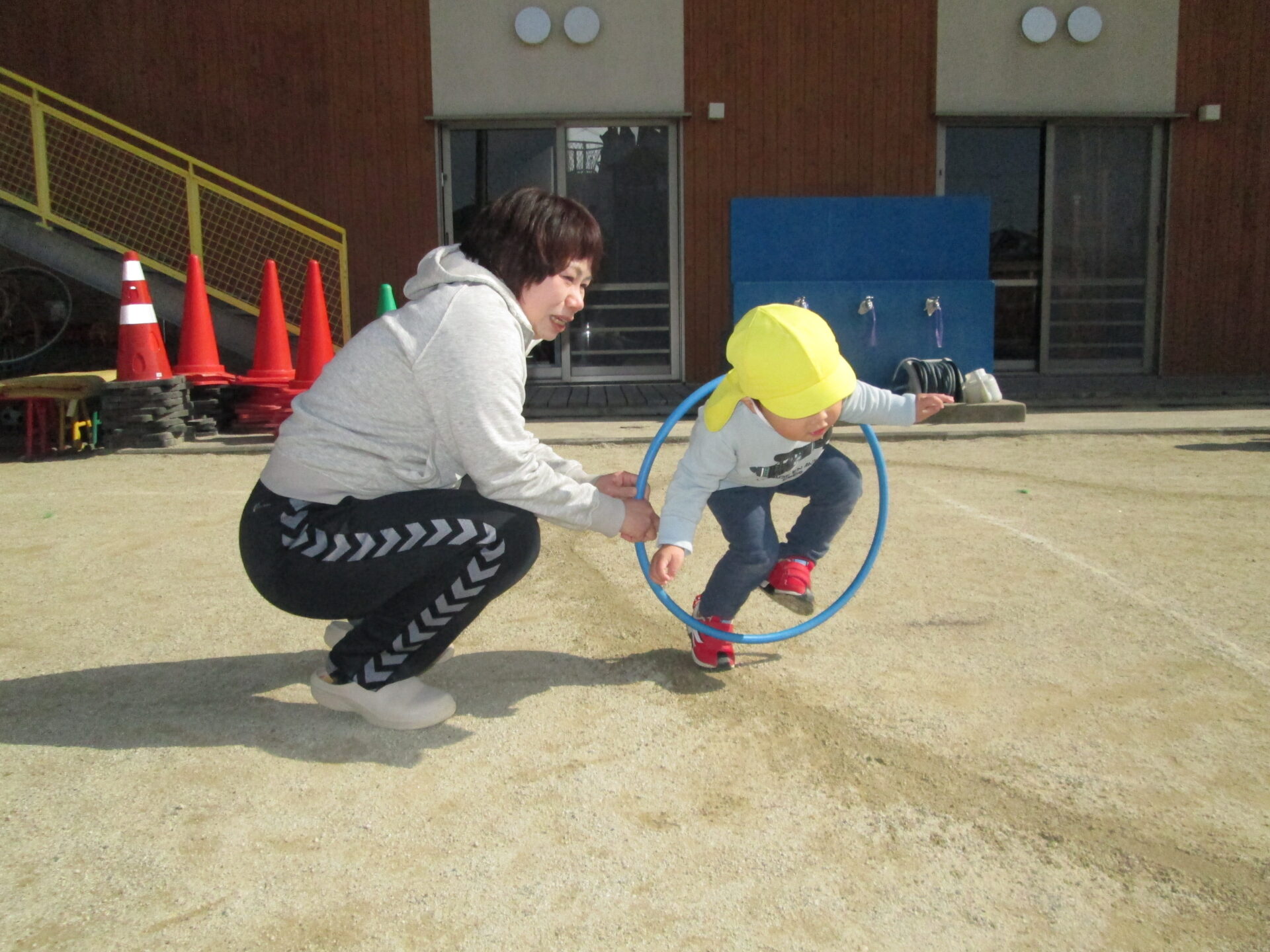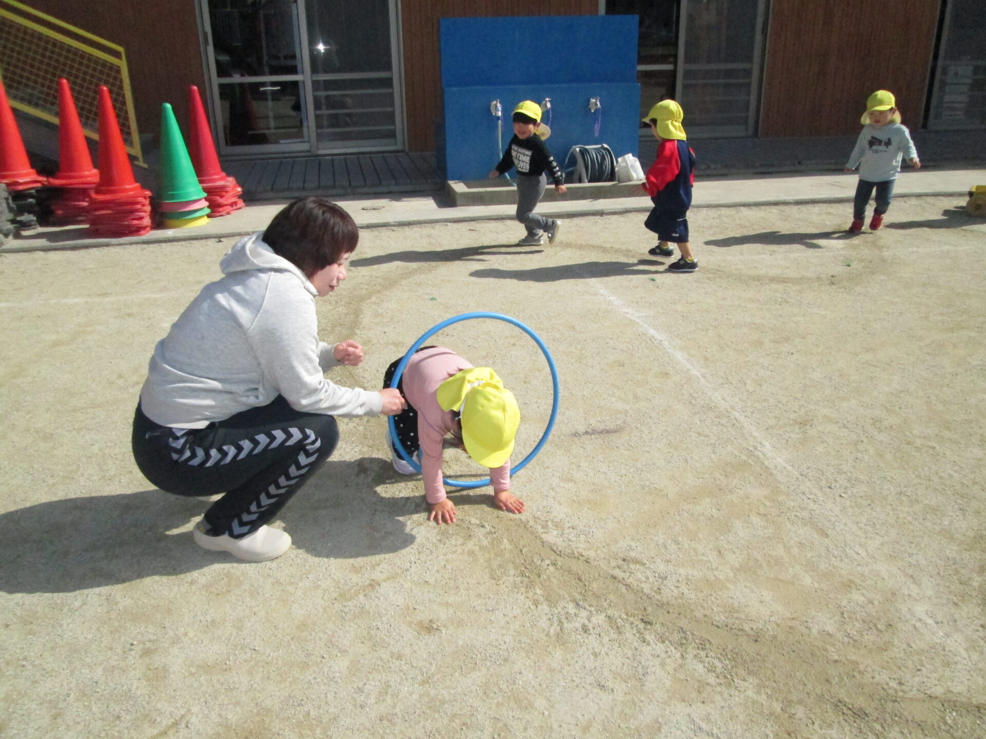 楽しむ子ども達。途中でフープのトンネルコーナーを作ると身体を上手に使いくぐっていましたよ♪