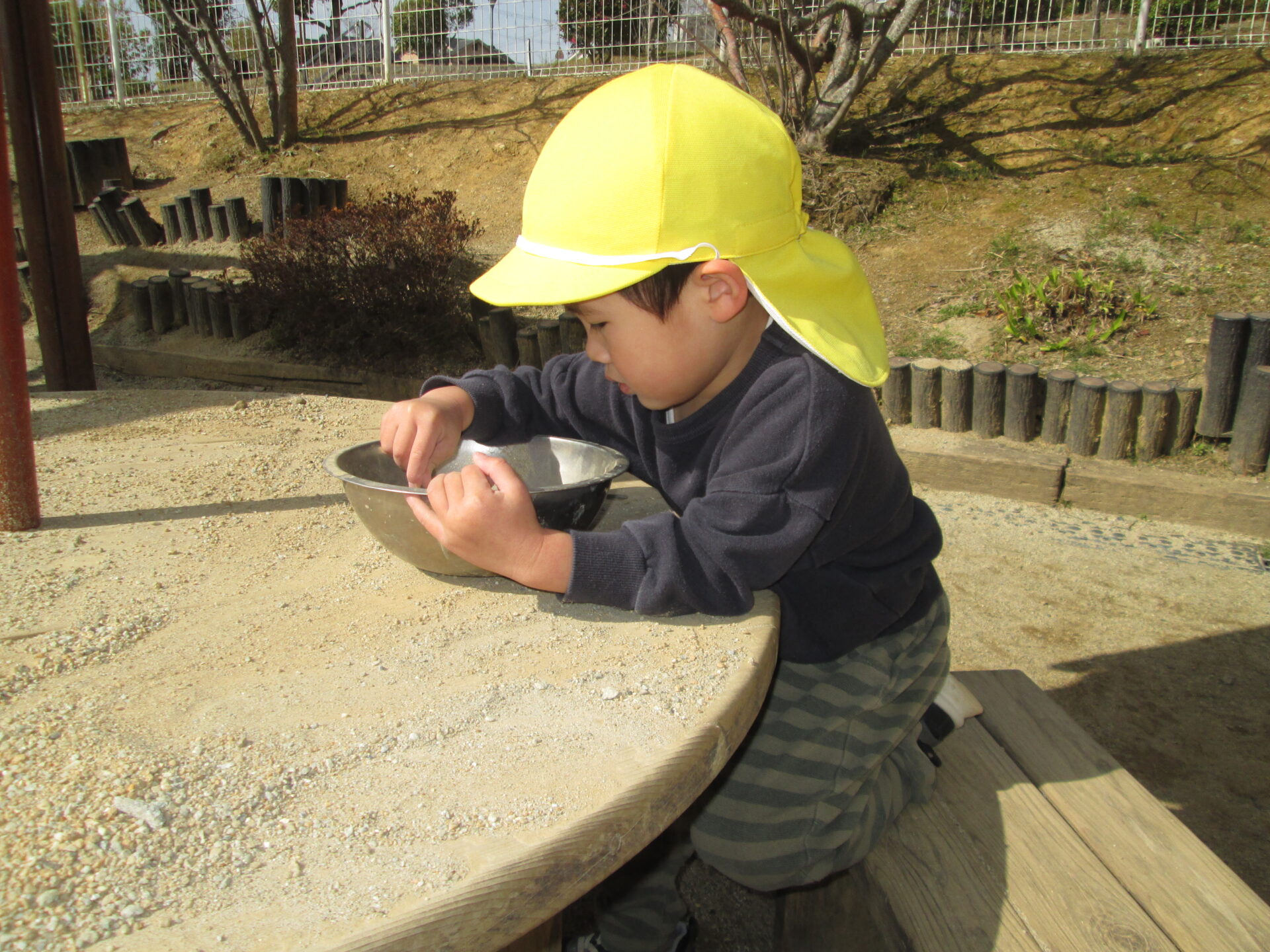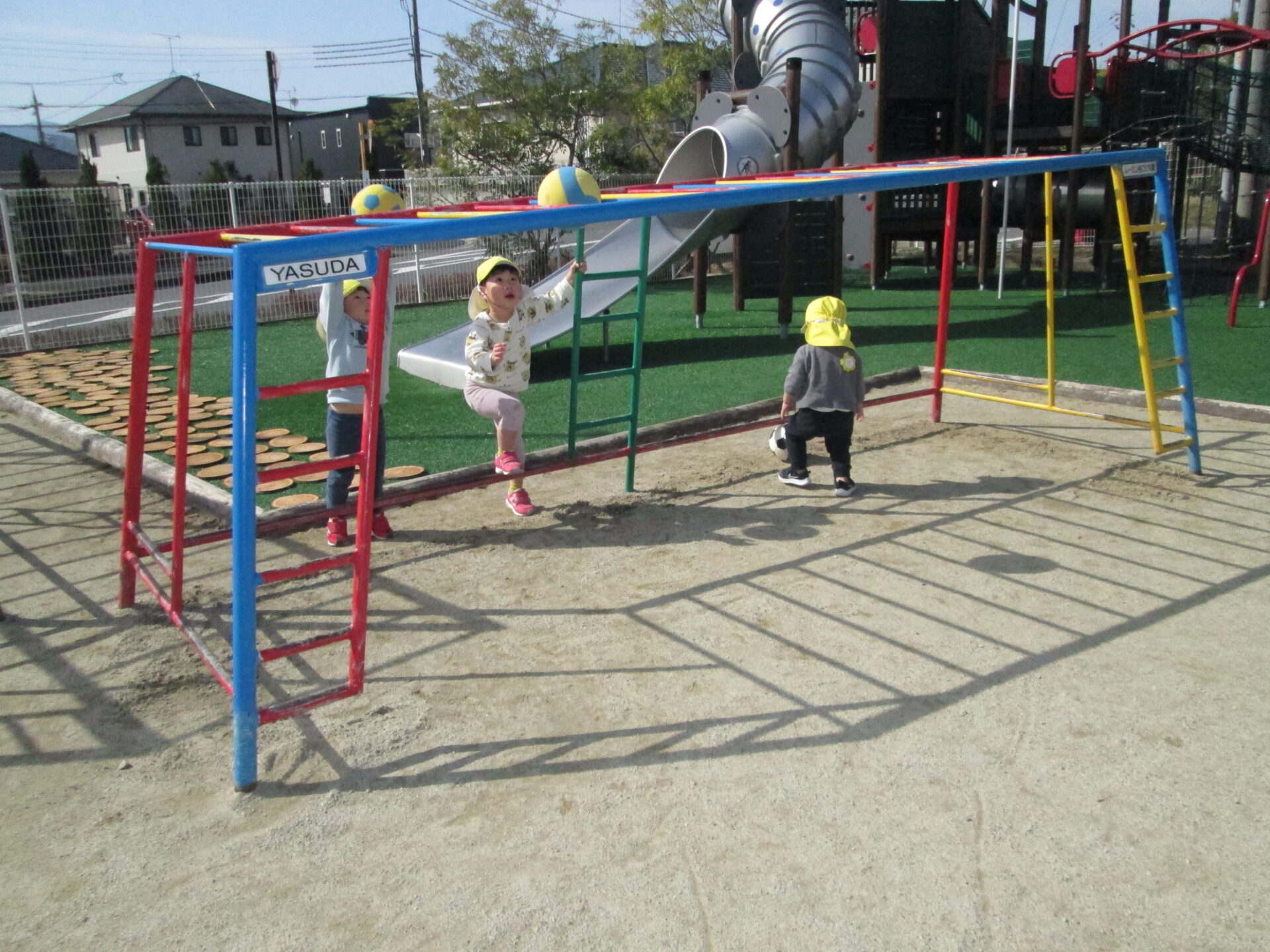 他にも「薬作ってるよ」と砂を混ぜたり、うんていの上に向かってボールを投げたり、