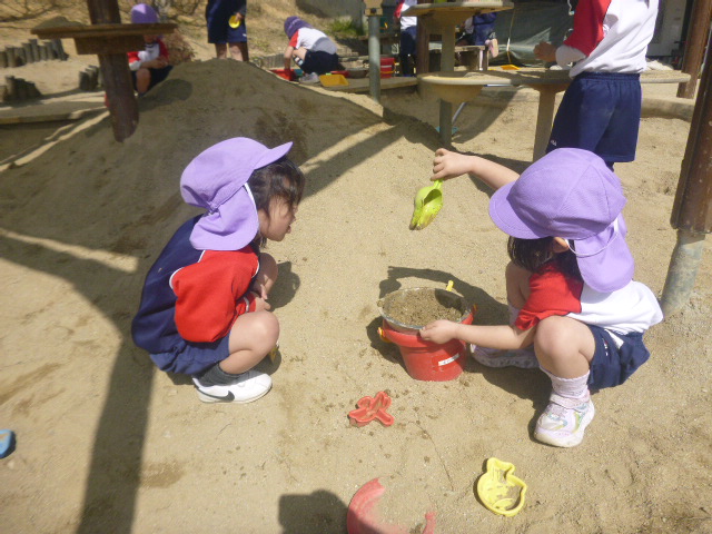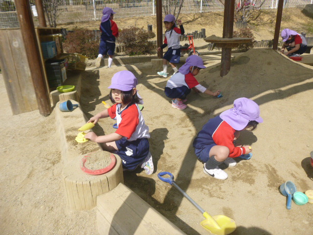 今日は天気がとてもよかったので大園庭で遊びました。太陽の光があたたかく感じられ春の訪れを感じました。