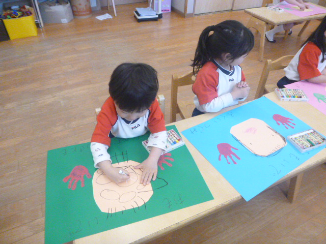 その後は造形指導で自分の顔を描き、「目はぐるぐるって描くよ」「可愛いお口にしよう」など友達と会話も楽しみながら描いていました。