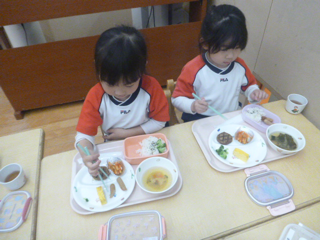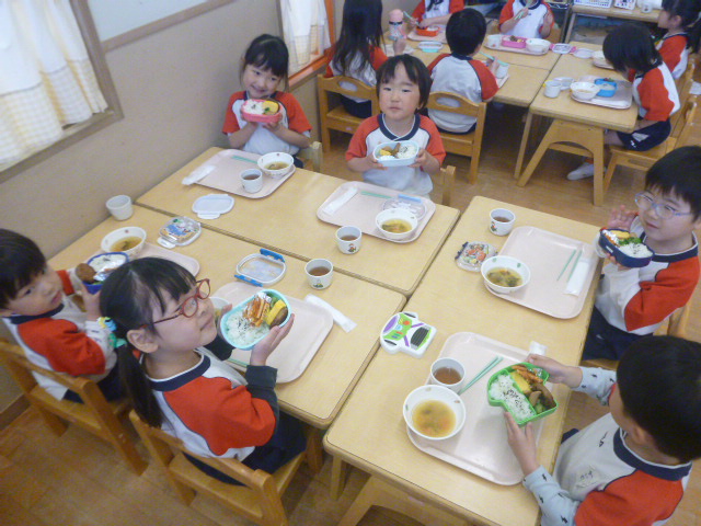 給食は『お弁当つめ体験』で持参したお弁当箱に、自分の思うように具材をつめ「おいしそうにできた!!」と喜んでいました。